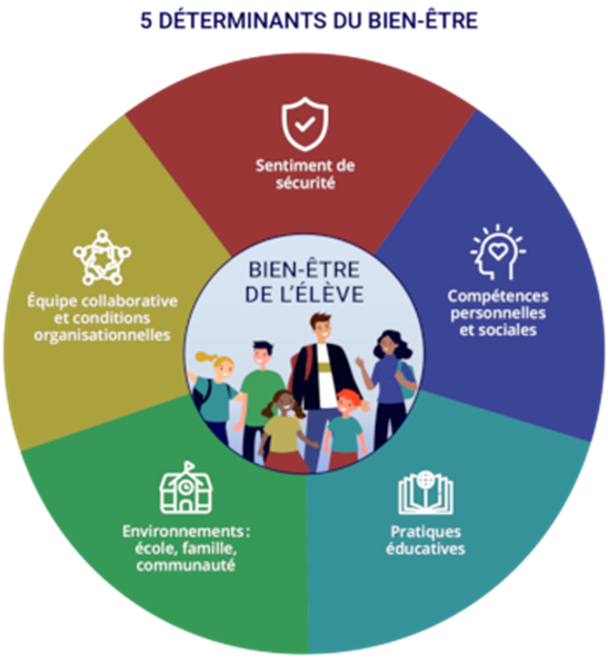 Dans une perspective globale, le climat scolaire est intimement lié aux déterminants du bien-être tels que présentés dans le Référentiel sur le bien-être à l’école du ministère de l’Éducation du Québec (2025).